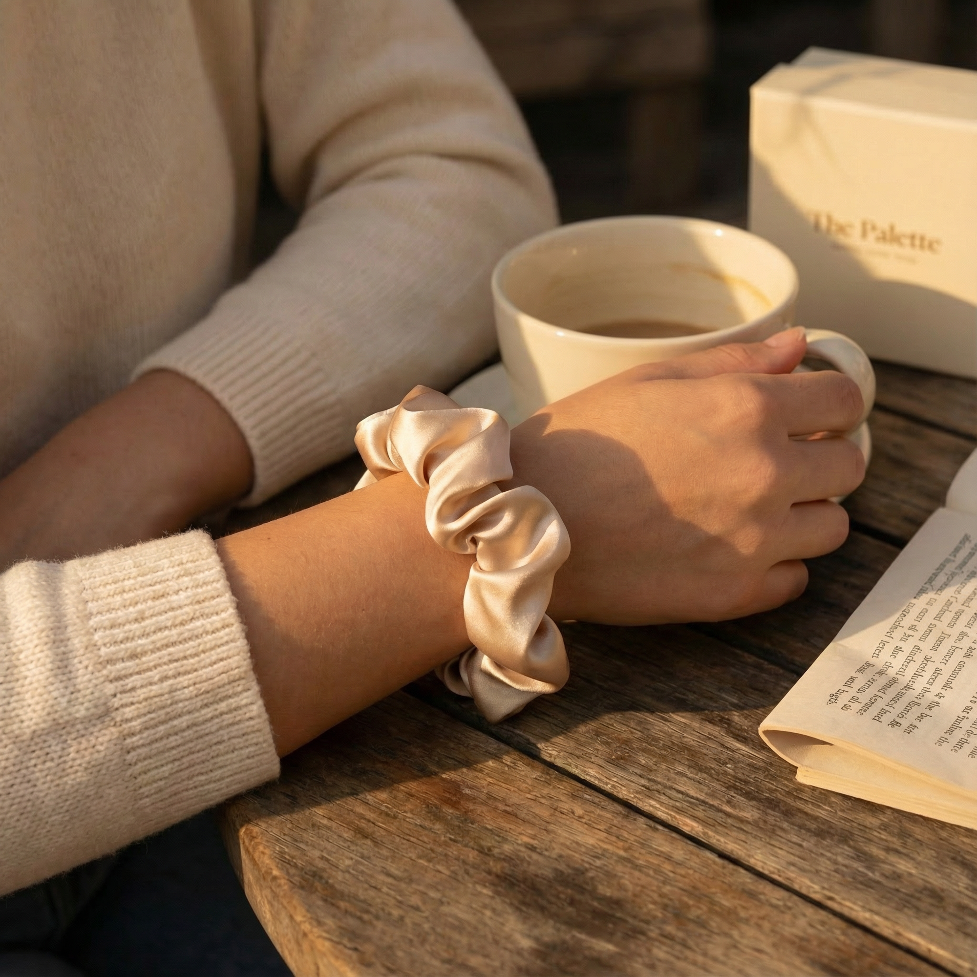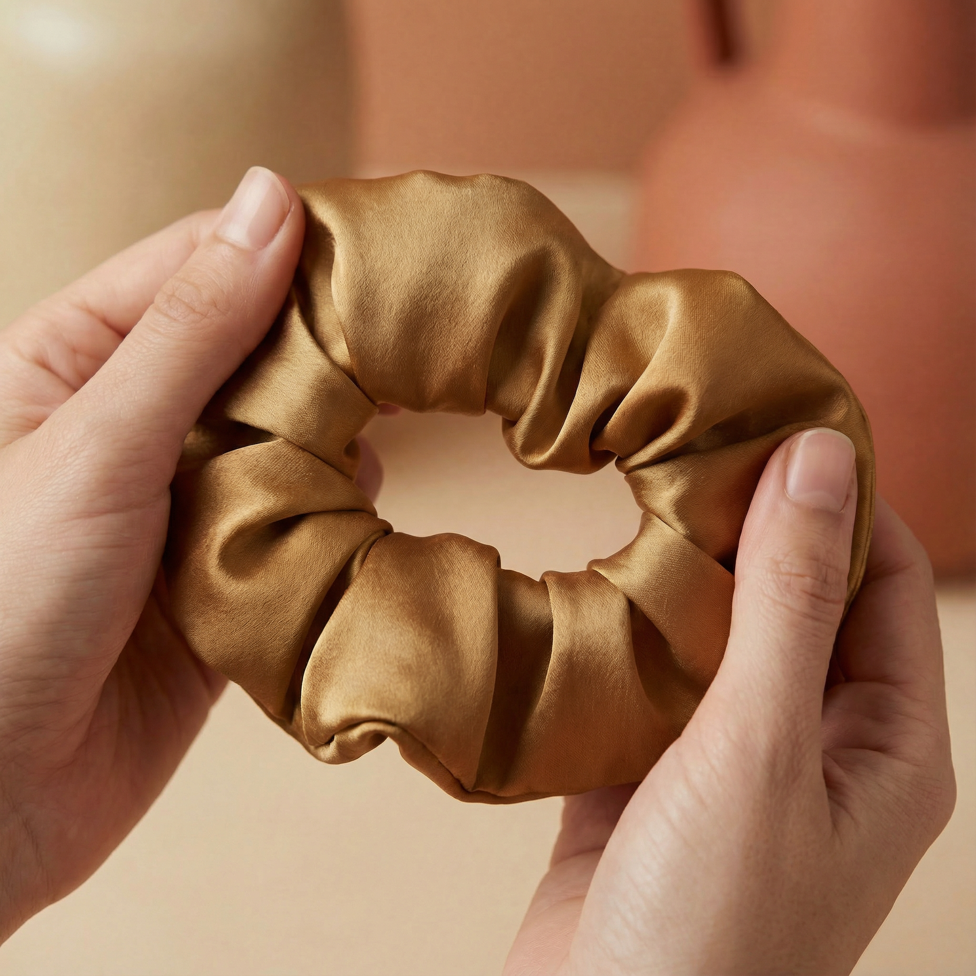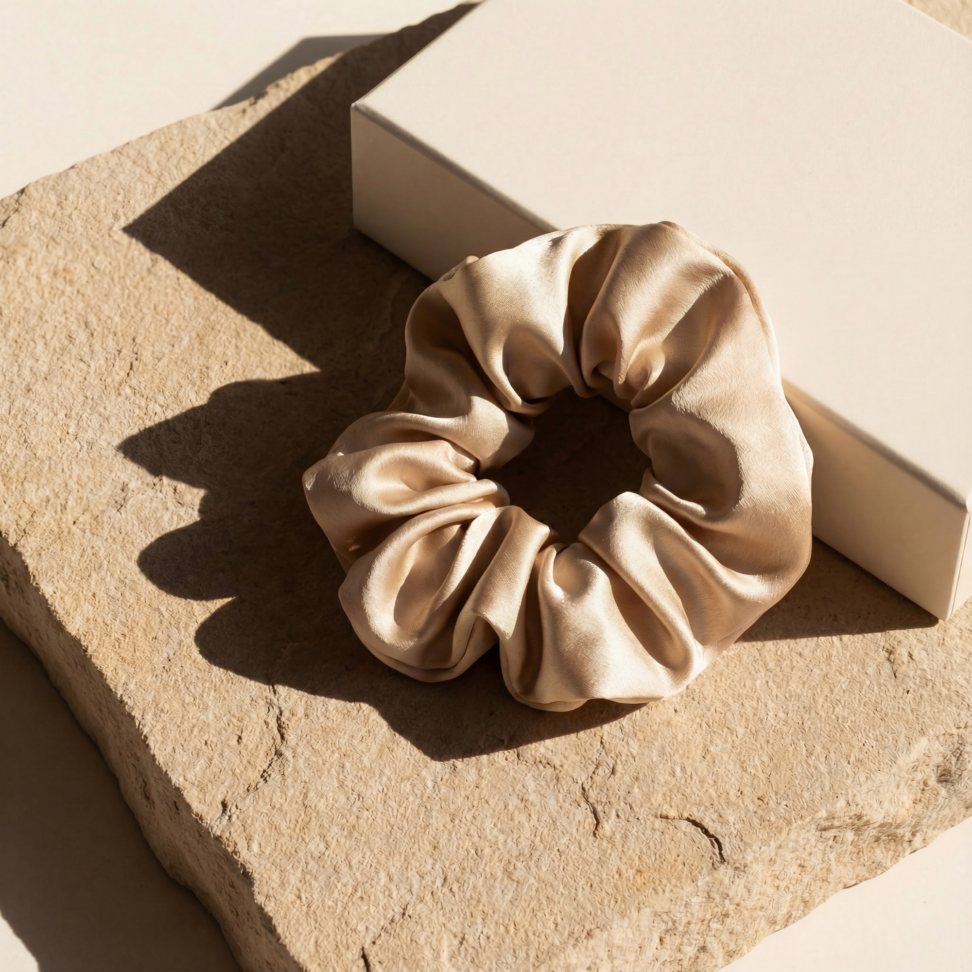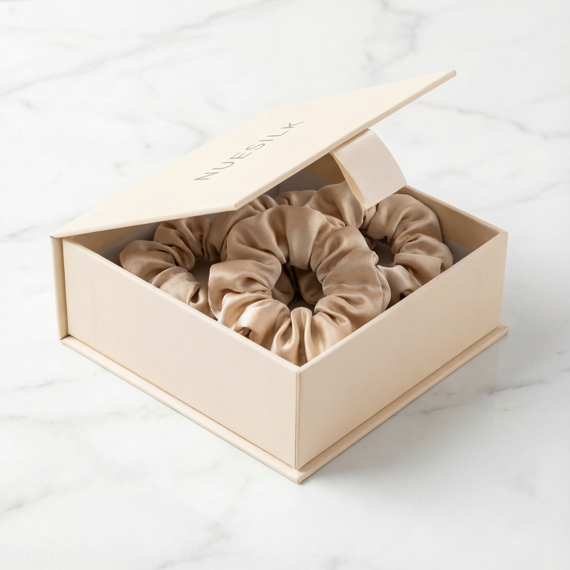 A reimagining of the everyday utility. Standard elastics rely on friction and tightness to secure the hair, often causing stress at the root. The NUESILK scrunchie operates on a principle of "soft suspension." It anchors the ponytail or bun with a secure hold that feels weightless, transforming a functional necessity into a moment of care.